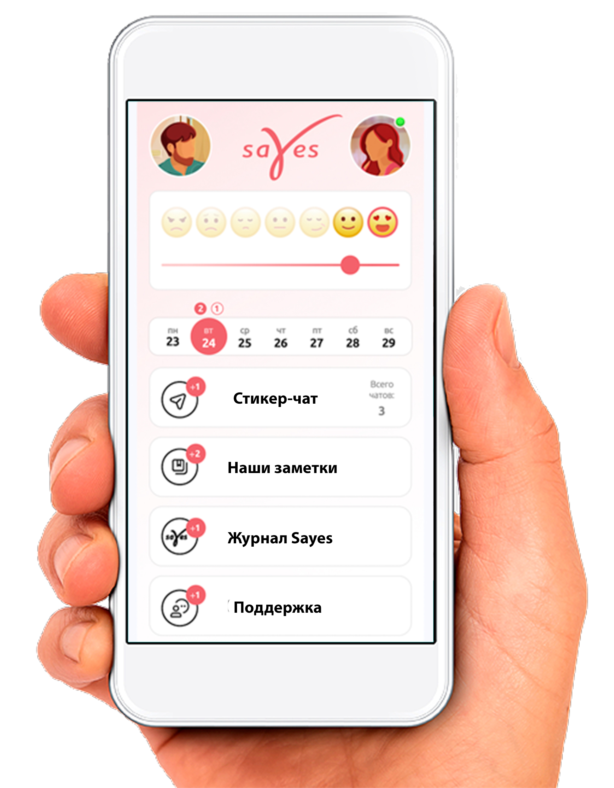 Обмен настроением. Стикер-чат чувств, эмоций и желаний. Интерактивный календарь для организации досуга, романтики и секса. Общий блокнот для заметок и пожеланий. Обширная библиотека советов и кризисная линия с экспертом.